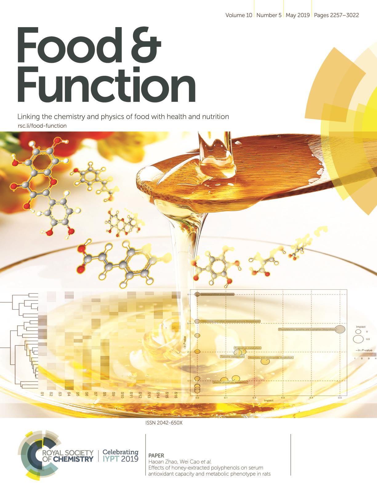 近日,365英国官网曹炜教授学术团队在食品科学领域国际著名学术期刊《Food & Function》发表了题为《Effects of honey-extracted polyphenols on serum antioxidant capacity and metabolic phenotype in rats》的学术论文,并被邀选为该刊5月封面文章。该研究在国际上首次报道了中华蜜蜂蜂蜜的生物活性成分及其对机体代谢的健康益处。
