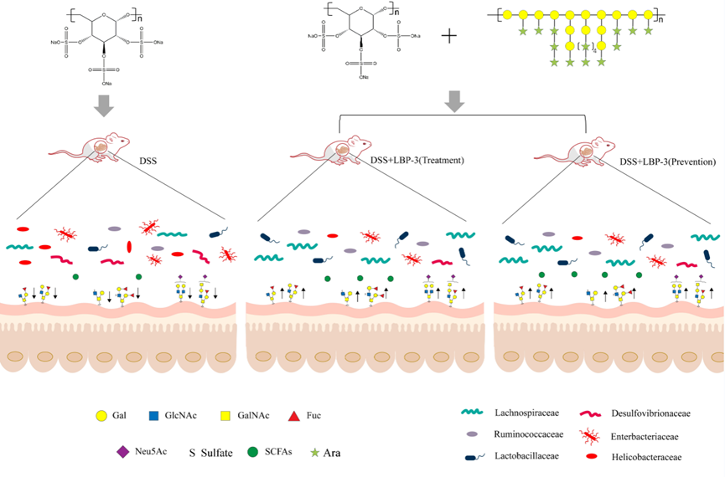 溃疡性结肠炎(UC)是一种难以彻底治愈的肠道炎症性疾病,其发病机制与肠道微生态紊乱,结肠粘蛋白O-糖链的异常表达,黏膜屏障功能失衡高度相关。目前UC的治疗药物常伴有发烧、过敏反应和感染等不良反应,无法长期使用,而天然多糖可有效预防或缓解结肠炎症状,副作用小,具有治疗结肠炎的潜力。