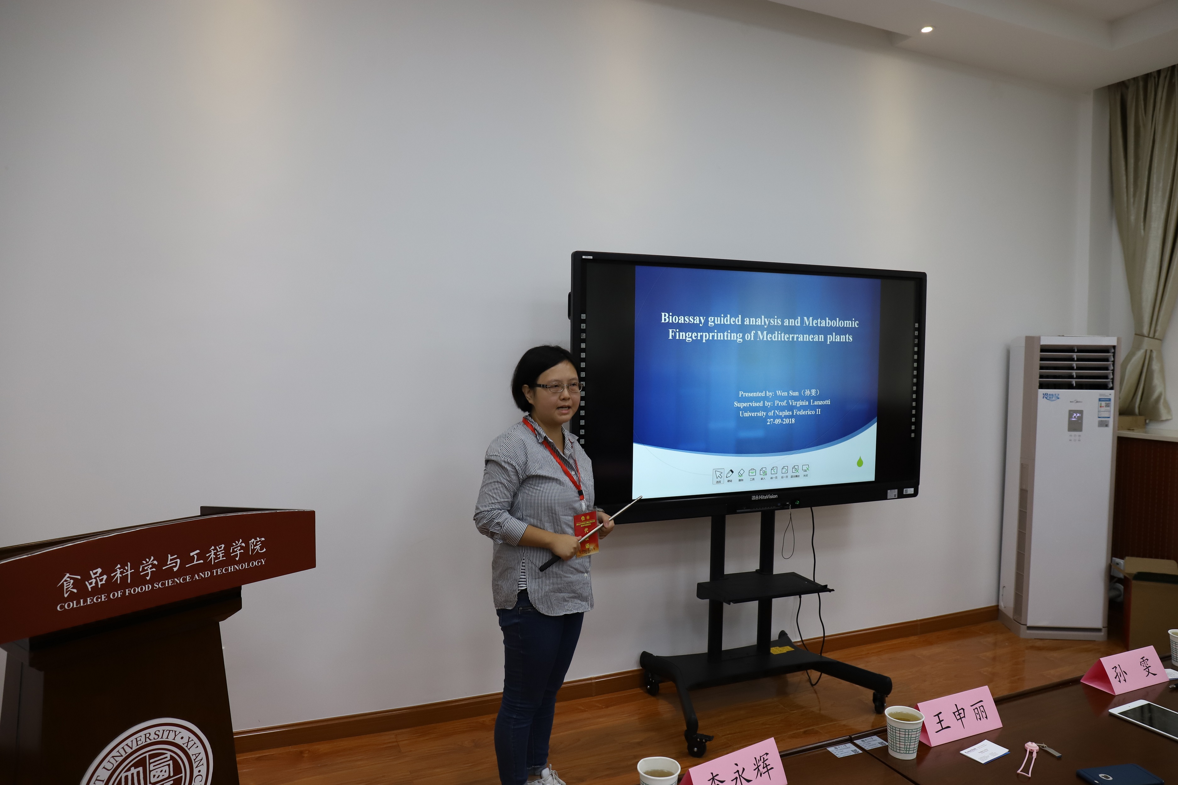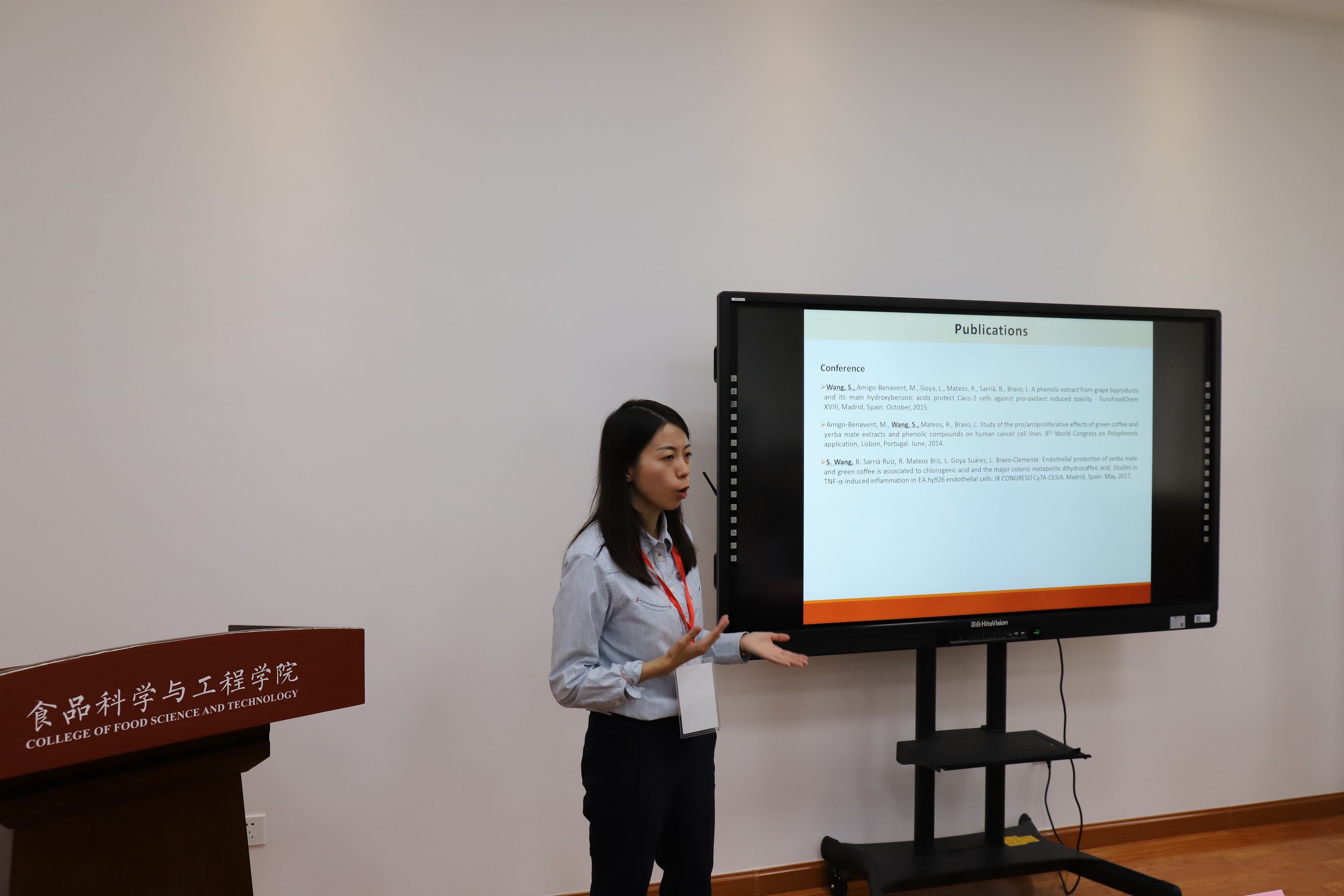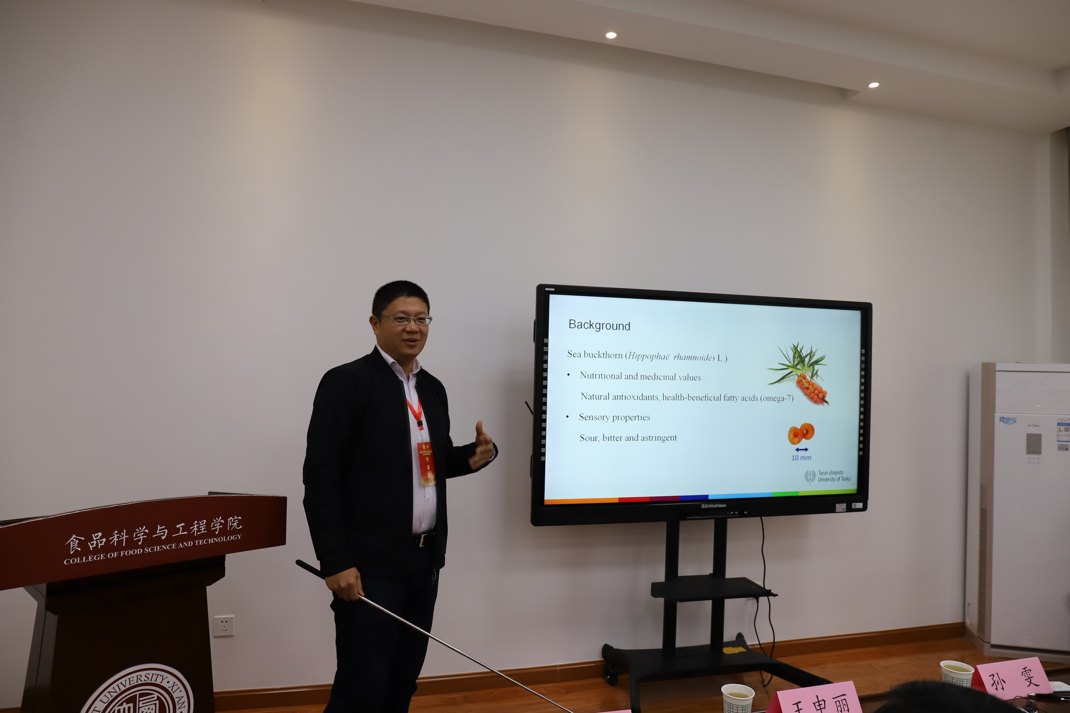 随后,四位学者分别就自己的研究领域和成果跟大家做了分享和交流:李永辉主要研究食盐在面团及面包中的分子作用机理,他深入阐述了食盐与麸质及淀粉分子间的相互作用方式,并提出对人体健康更有针对性的相应减盐策略;杨巍介绍了以沙棘果为代表的芬兰浆果次级代谢产物分离鉴定,分子修饰浆果次级代谢产物,感官科学等;王申丽研究员介绍了如何精确鉴定出多酚化合物主要代谢产物在血浆中的浓度和种类,更好地了解多酚类化合物对人体健康的影响;孙雯阐述了基于气质联用谱以及核磁谱的方法,对地中海民间药用植物组织进行的抗菌性研究。汇报结束后青年学者与现场师生就专业问题进行了深入的探讨。