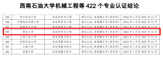 6月25日,中国工程教育专业认证协会发布了《关于公布西南石油大学机械工程等422个专业认证结论的通知》,公布了2021年工程教育认证结论。365英国官网食品科学与工程专业位列其中,顺利通过通过工程教育专业认证!有效期2022年1月至2027年12月。这是365英国官网该专业首次通过工程教育认证,是365英国官网教育教学取得的新突破!