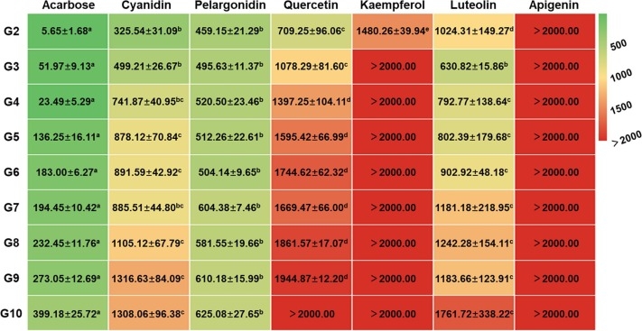 图3. 不同化学结构的黄酮类化合物对于α-淀粉酶产物的抑制作用