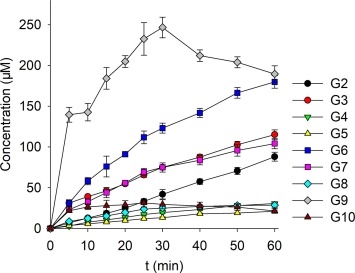 α-淀粉酶产物是1→4键连接的葡聚糖寡糖,聚合度介于2和12之间。聚合度为9的产物的产量最高,且在淀粉消化过程中先增加后减少。其他四种产物分别为2,3,6和7的产物产率在酶反应过程中不断增加。聚合度为4,5,8和10的产物产量相对较低。