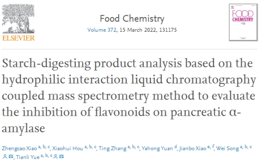 我院岳田利教授团队开发出一种基于亲水色谱(HILIC)和质谱(MS)联用的方法用于评价α-淀粉酶的活性,并用于黄酮类化合物对α-淀粉酶抑制作用的评价。研究结果发表在国际食品TOP期刊Food Chemistry(Q1,IF:9.231)上,题为“Starch-digesting product analysis based on the hydrophilic interaction liquid chromatography coupled mass spectrometry method to evaluate the inhibition of flavonoids on pancreatic α-amylase” 。该研究得到国家博士后面上项目的支持,论文第一作者为我院营养健康食品与安全控制团队肖郑操博士后,通讯作者为岳田利教授,宋微副教授,论文第一单位为365英国上市公司官网。
