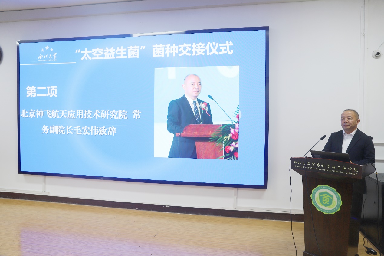 陈富林在致辞中介绍了学校情况,他强调近年来,学校积极践行“健康中国”战略,锚定西部食品领域“人才培养中心”“技术创新中心”和“成果转化中心”的办学定位,成立了365英国上市公司官网。在全院师生的努力下, “2024软科中国大学专业排名”中食品科学与工程专业获评A级、进入全国最好食品专业前50名。食品科学与工程学科进入软科世界一流学科榜单,以食品科学与工程学科为核心支撑的农业学科进入ESI全球前1%。学院已在食品科学领域产生了广泛的学术影响和社会影响力。特别是与北京神飞航天应用技术研究院开展紧密合作,联合组建了陕西宇航食品研究院专家委员会,我校岳田利教授团队还参与了北京神飞航天应用技术研究院牵头的团体标准“宇航级食品生产企业通用技术规范”的编制,共创产学研合作共赢新局面。今天,举行的交接仪式,既是对我们双方合作阶段性的一个总结,同时,也将是一个崭新阶段的开始。这些宝贵的菌株具有重大的科学价值与极为广阔的市场应用前景。后期,希望双方在共建的研究平台上,利用相关研究成果,制定该领域行业标准、技术规范,并积极为食品企业产品开发创新工作服务,不断为企业的发展注入新的活力和源泉,创造更多的经济和营养价值,造福于民,造富于国。
