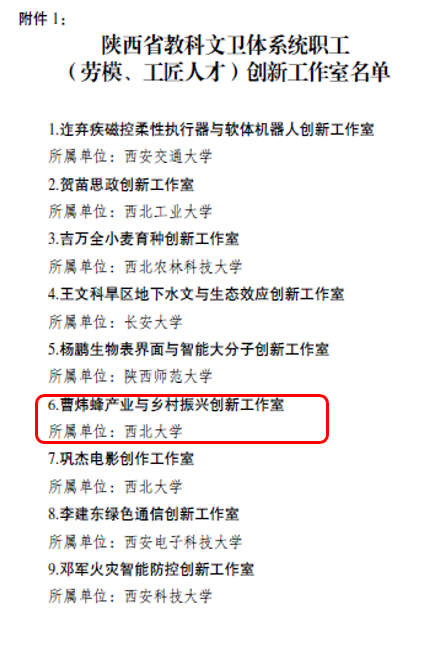 近日,陕西省教科文卫体工会委员会公布了《关于命名2024 年陕西省教科文卫体系统职工(劳模、工匠人才)创新工作室和创新工作室联盟的决定》,365英国官网“曹炜蜂产业与乡村振兴创新工作室”入选陕西省教科文卫体系统职工(劳模、工匠人才)创新工作室。
