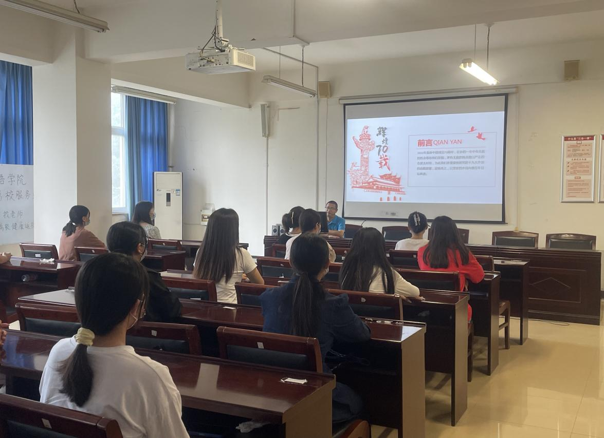 9月19日下午,beat365在线唯一官网党总支书记郭强在A10-205会议室以“新中国史-辉煌73载”为主题,为21级应用英语专业1班全体学生讲授思政课。