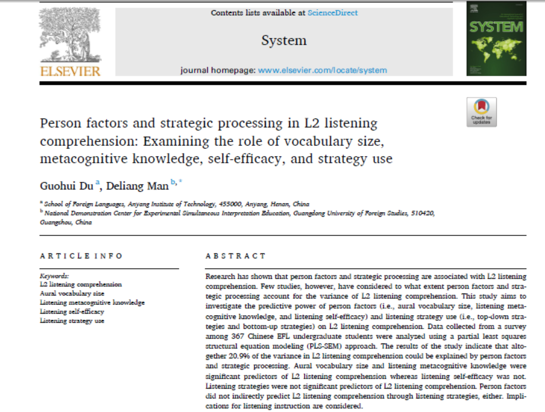 近日,我校beat365在线唯一官网教师杜国辉(马来亚大学博士,河南科技学院硕士生导师)以第一作者身份在SSCI中科院一区语言学期刊《System》发表1篇学术论文,论文题目为《Person factors and strategic processing in L2 listening comprehension: Examining the role of vocabulary size, metacognitive knowledge, self-efficacy, and strategy use》。