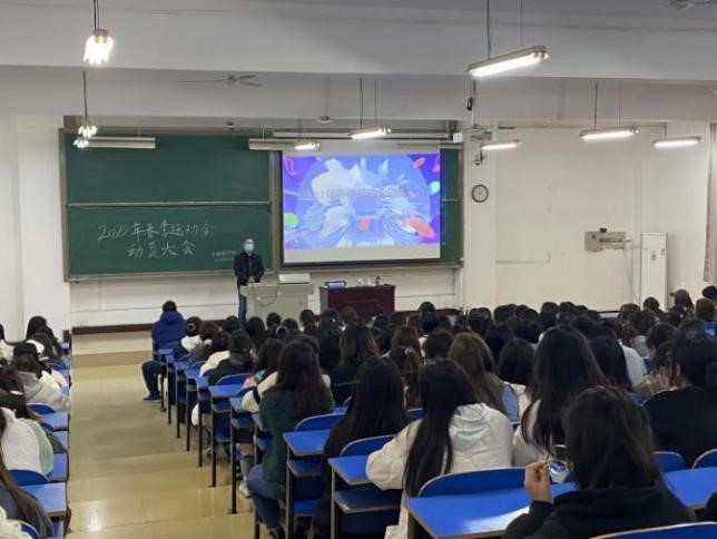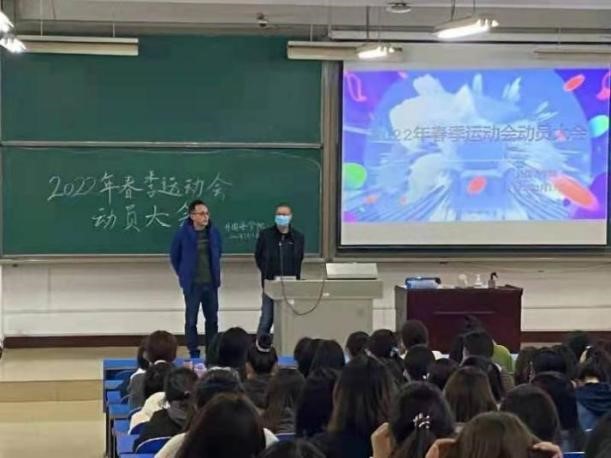 2022年3月13日下午,beat365在线唯一官网党总支书记郭强同志和杜国辉老师带领学生会等成员,在A17-102教室为全体21级大一新生宣讲二零二二年春季运动会动员大会的相关事宜。