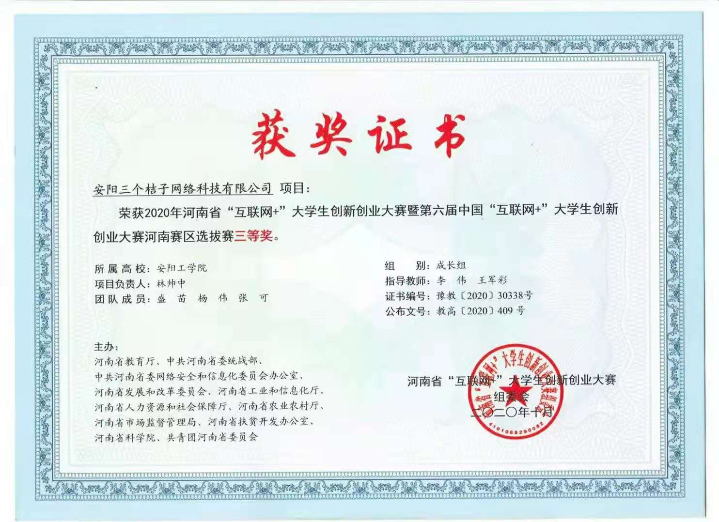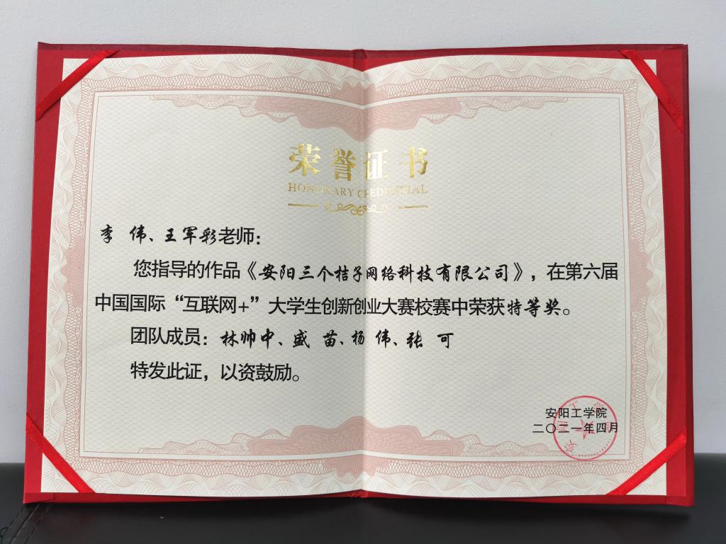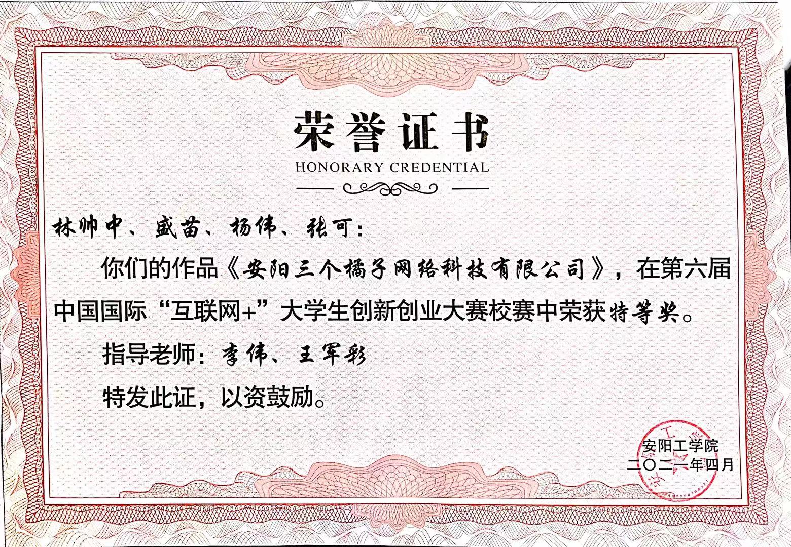 “互联网+”大学生创新创业大赛河南省选拔赛获奖证书