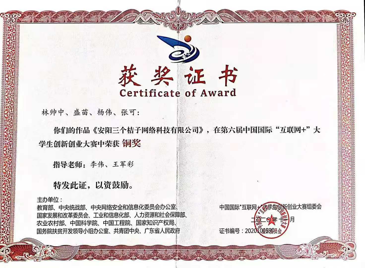 第六届中国国际“互联网+”大学生创新创业大赛获奖证书