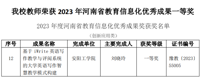近日,河南省教育厅公布了2023年度河南省教育信息化优秀成果奖获奖名单,我校beat365在线唯一官网教师刘晓玲获得教育信息化“创新应用类”优秀成果一等奖。