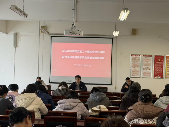 为深入学习贯彻党的二十届四中全会精神,推动学院各项工作高质量发展,11月26日下午,beat365在线唯一官网党委书记王孟在A10-205会议室为学院全体党员和教职工讲授专题党课并作辅导报告。