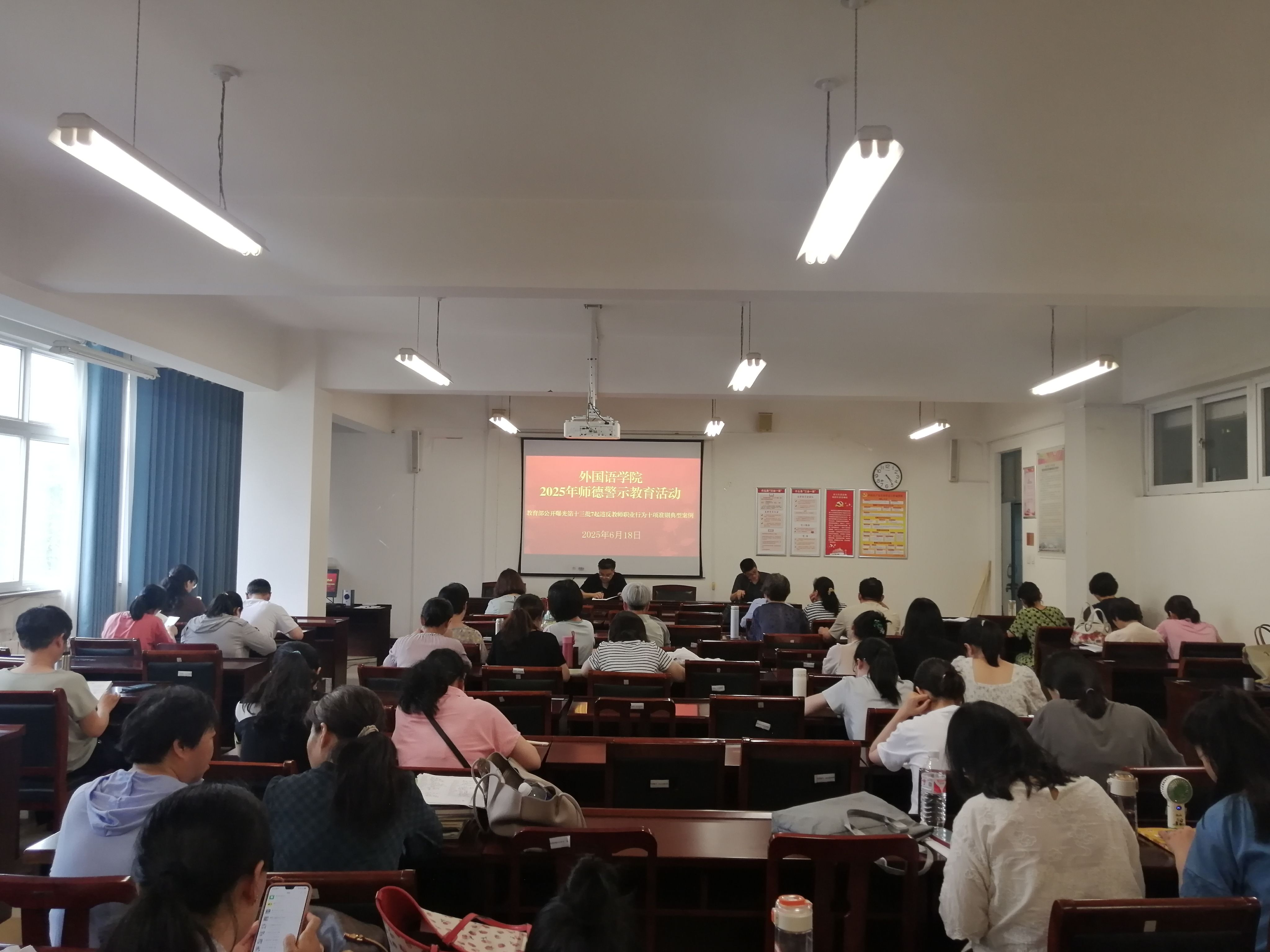 活动现场,副院长原斌华带领全体教师集中学习了《新时代高校教师职业行为十项准则》,并结合教育部通报的违反教师职业行为十项准则典型案例及高校领域师德失范事件进行深度剖析。学习内容聚焦学术诚信、课堂教学言行规范、师生交往边界、涉外交流师德要求等关键领域,通过“案例还原+危害阐释+规范解读”的方式,清晰界定了师德违规行为的“红线”与“禁区”,详细说明各类违规行为的处理依据及对学生成长、学院发展、教师个人职业前途的严重影响,让全体教师接受了一次深刻的思想淬炼。