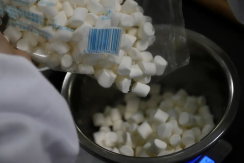 黄油放不粘锅里小火融化后倒入棉花糖,翻炒至融化以后加入一定量的奶粉;