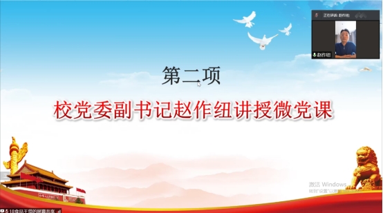 随后,校党委副书记赵作纽结合学习习近平总书记重要讲话精神情况、学校疫情防控工作开展情况和在西安航空学院莲湖校区抗疫经历,为大家讲授了微党课。赵书记指出,这场疫情大考展示了我们党和国家力量的强大,展现了万众一心、众志成城的强大合力,彰显了中国特色社会主义制度的优越性。他希望同学们深入弘扬伟大建党精神,用坚定党性描绘人生底色,在疫情防控中勇于担当负责;要拥有家国情怀,用大视野、大格局去面对疫情,提高面对苦难的勇气和抵御挫折的能力;要充分发挥党员的先锋模范作用,理性发声,共同营造积极向上的抗疫舆论氛围。