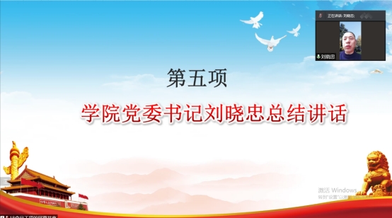 活动最后,学院党委书记刘晓忠做总结讲话。他指出,今天的主题党日活动有意义,活动安排有特色;赵书记的微党课分享结合个人工作生活实际,内容丰富,既有理论高度,又有情感温度和实践深度,为我们下一步工作指明了方向。随后,他从推进马克思主义中国化时代化、正确把握社会主要矛盾和中心任务、重视战略策略问题、永葆党的马克思主义政党本色、党史学习教育常态化长效化等五个方面,与大家分享了学习习近平总书记重要讲话精神的心得体会。最后,他要求大家要切实做好个人自我防护,合理安排个人学习、工作和生活,积极参加志愿服务,在疫情防控的实践中践行“请党放心,强国有我”的青春誓言。